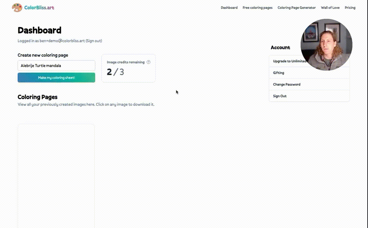 Generate your masterpiece: Click the "Generate" button, and ColorBliss will use its AI to create a unique coloring page based on your description.